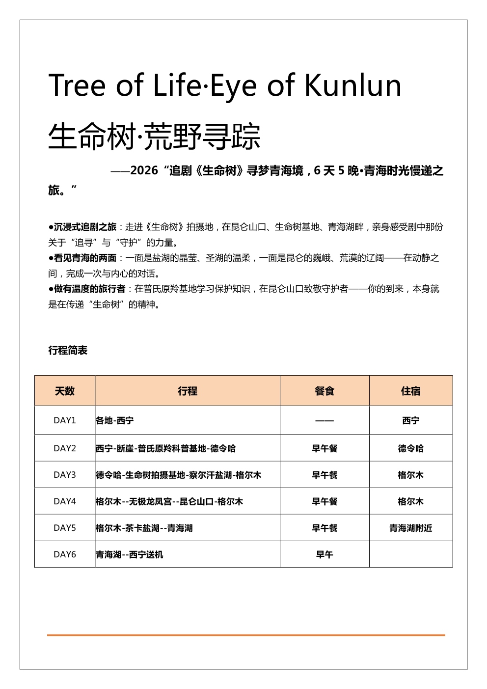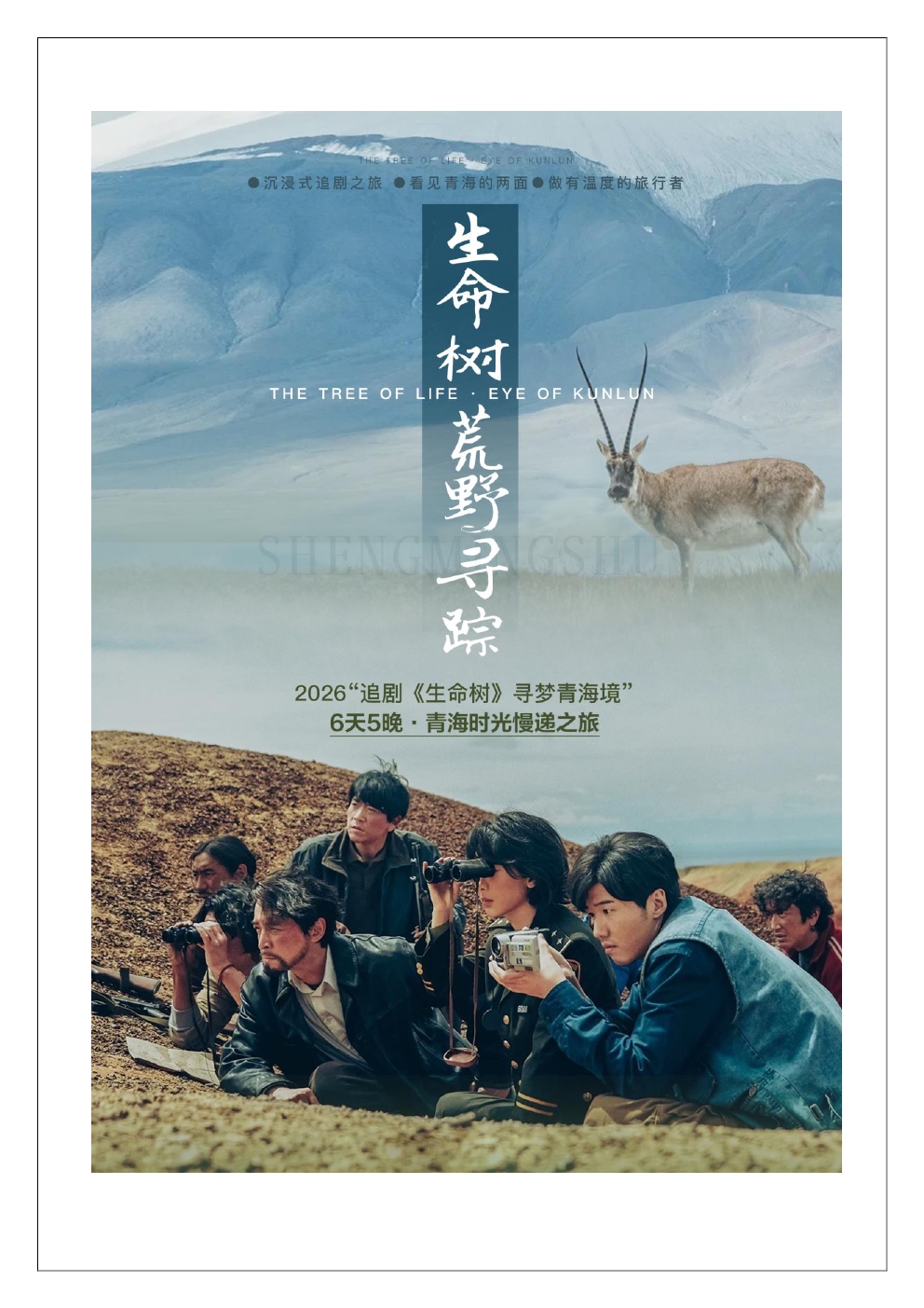 ●沉浸式追剧之旅:走进《生命树》拍摄地,在昆仑山口、生命树基地、青海湖畔,亲身感受剧中那份关于“追寻”与“守护”的力量。·看见青海的两面:一面是盐湖的晶荤、圣湖的温柔,一面是昆仑的巍峨、荒漠的辽阔--在动静之间,完成一次与内心的对话。做有温度的旅行者:在普氏原羚基地学习保护知识,在昆仑山口致敬守护者--你的到来,本身就是在传递“生命树”的精神。