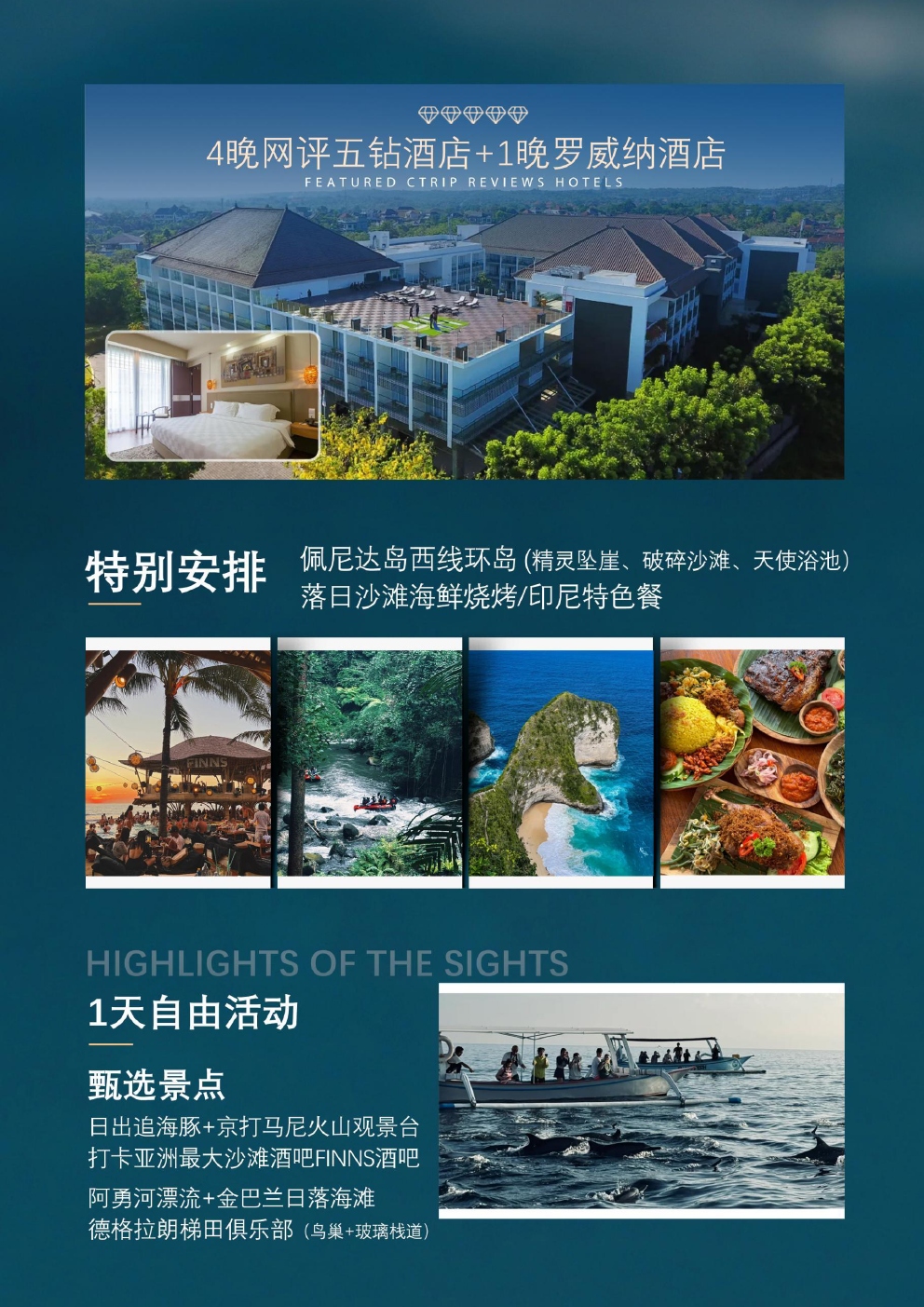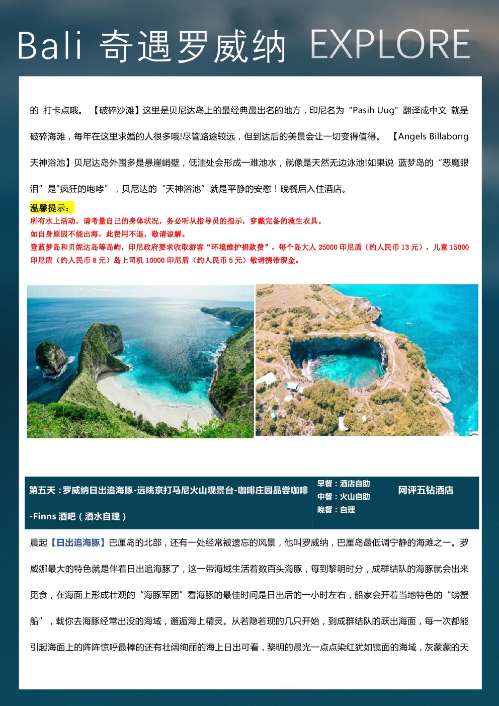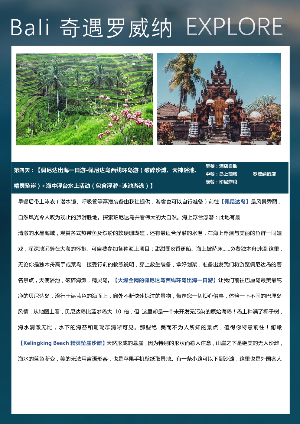 火遍全网的著名出海岛屿-佩尼达岛西部环岛游,打卡苹果手机壁纸取景地-精灵坠崖,俯瞰精灵沙滩,天使浴池,破碎海滩;乌鲁瓦图悬崖公路、罗威纳追海豚、京打马尼火山远观自我自在:1天自由活动,你的行程你做主美食诱惑:全心升级美食无界限,品味最为地道的巴厘岛美食: