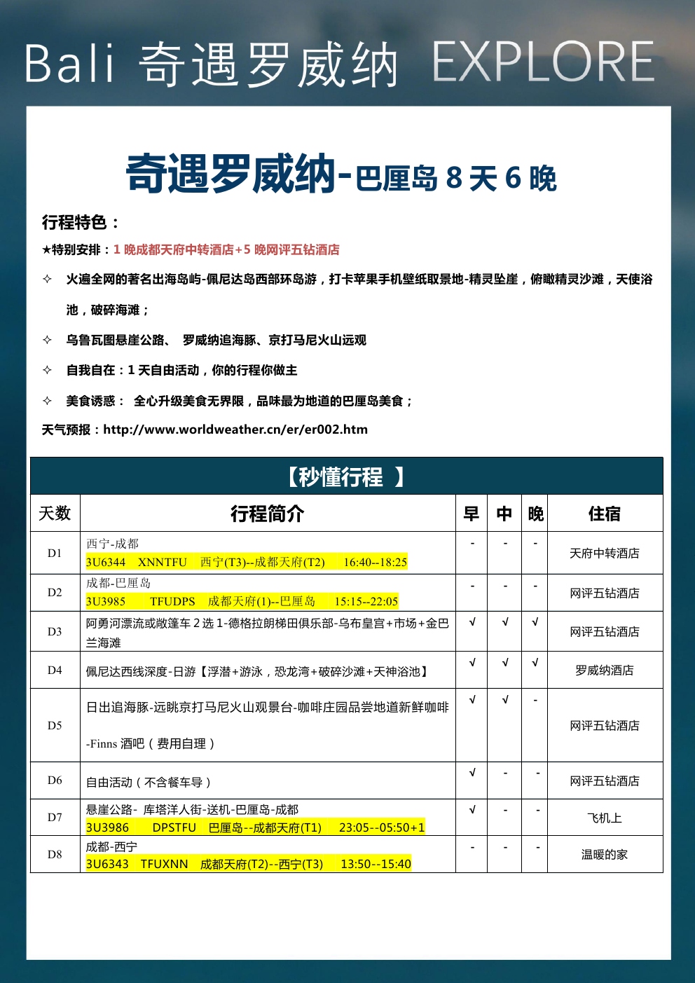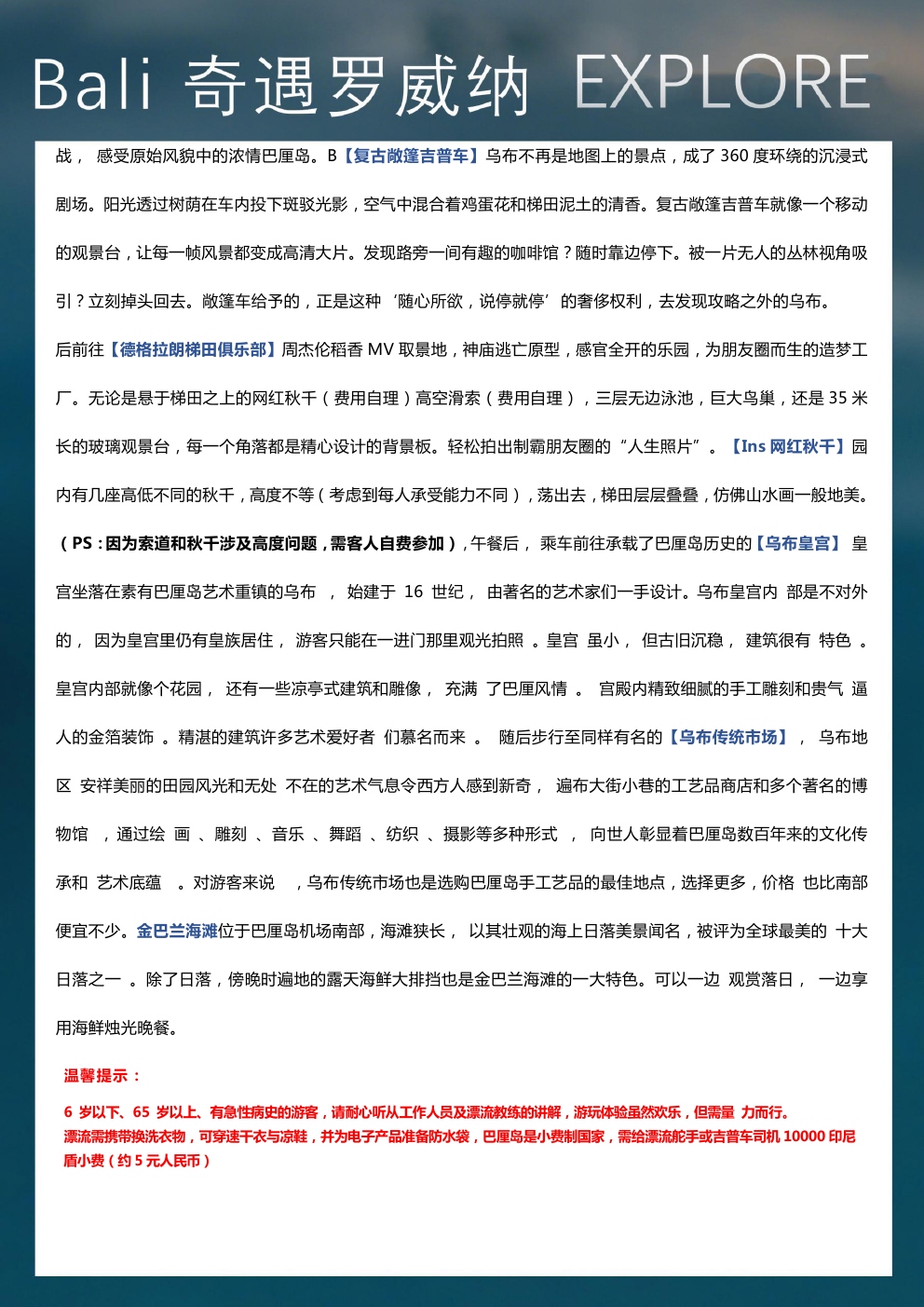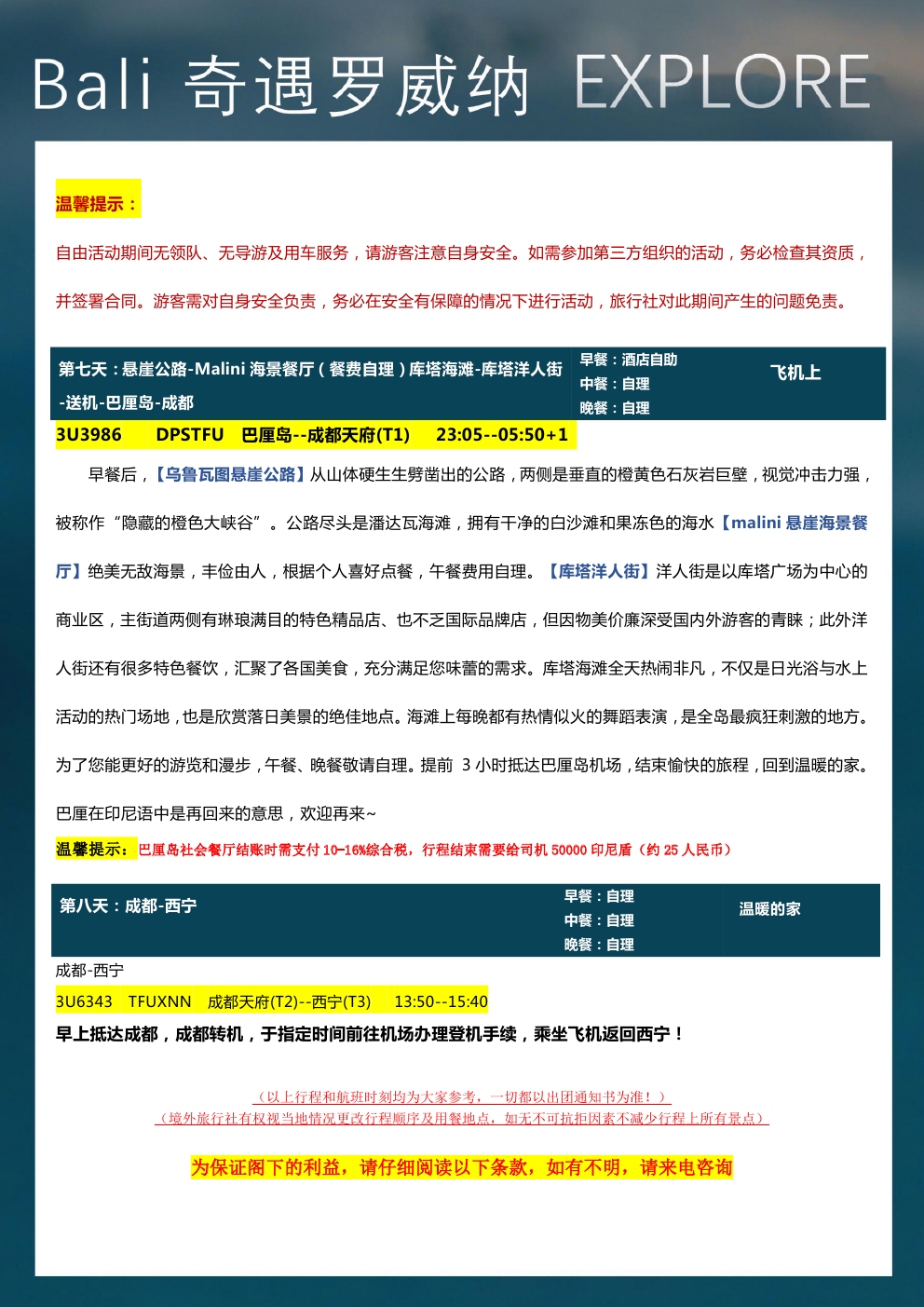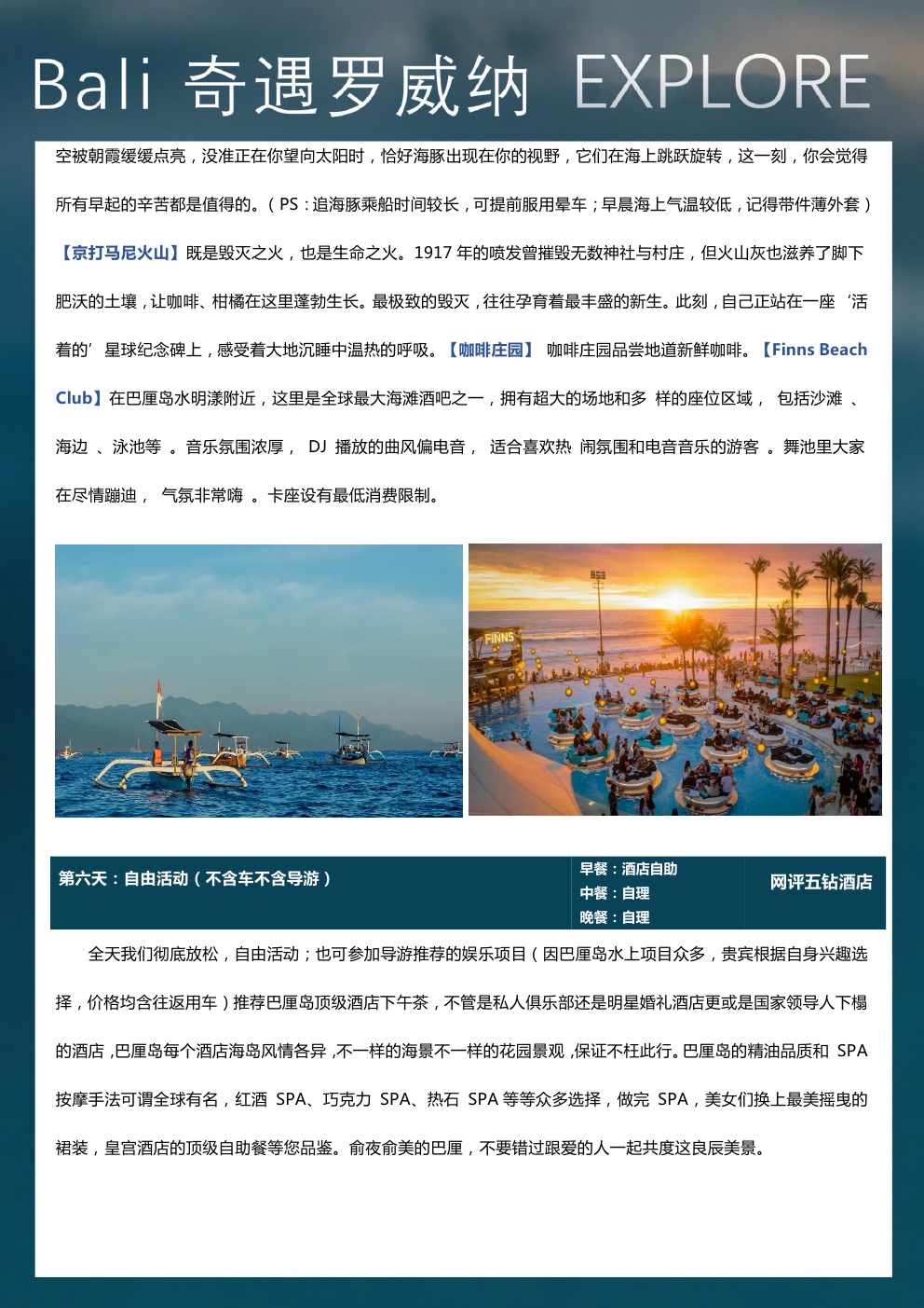 火遍全网的著名出海岛屿-佩尼达岛西部环岛游,打卡苹果手机壁纸取景地-精灵坠崖,俯瞰精灵沙滩,天使浴池,破碎海滩;乌鲁瓦图悬崖公路、罗威纳追海豚、京打马尼火山远观自我自在:1天自由活动,你的行程你做主美食诱惑:全心升级美食无界限,品味最为地道的巴厘岛美食: