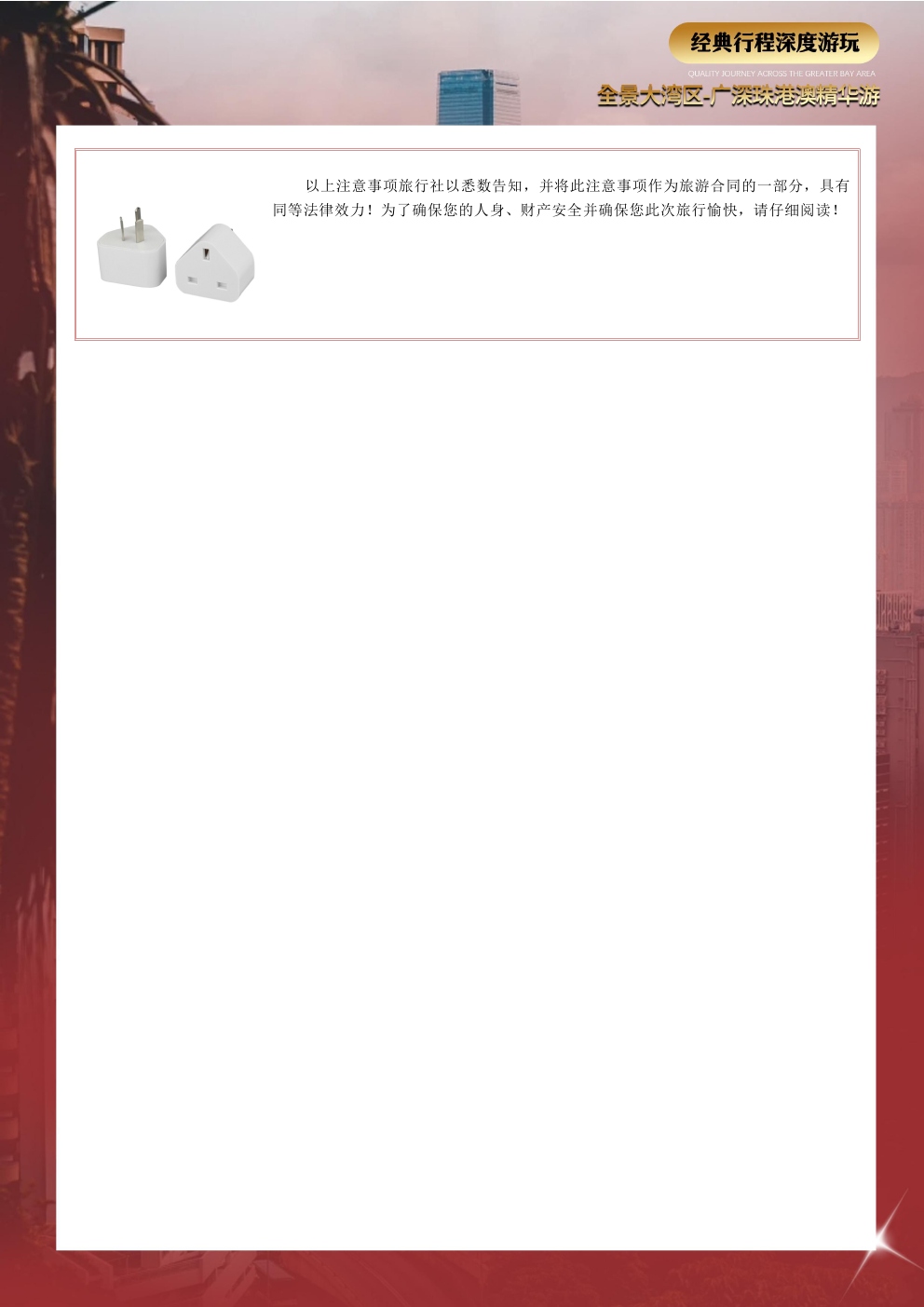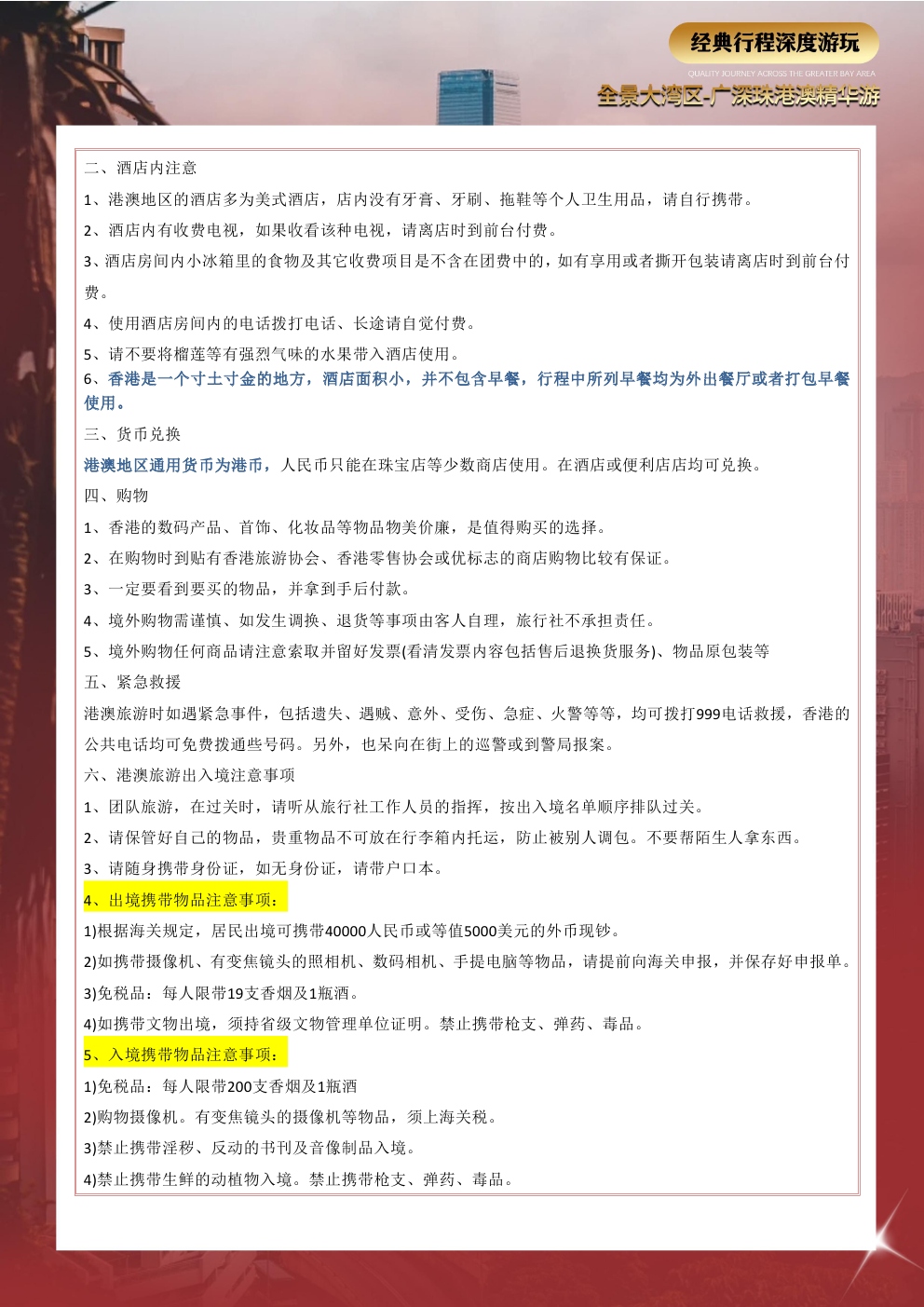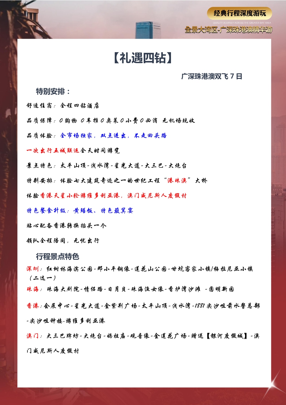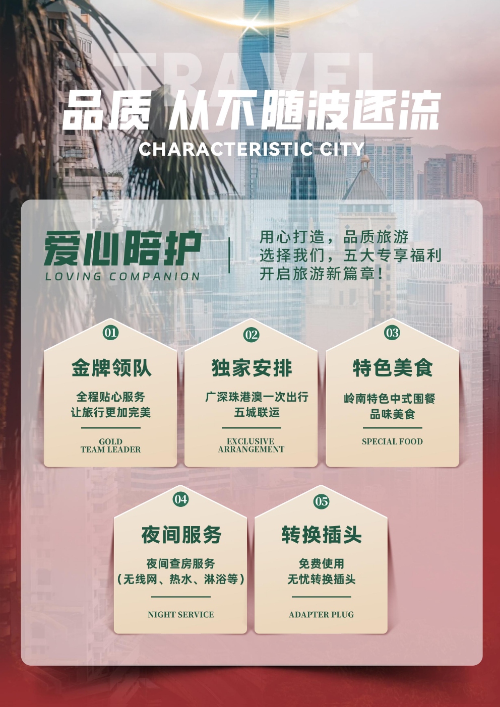爱心陪护用心打造,品质旅游选择我们,五大专享福利开启旅游新篇章!全程贴心服务让旅行更加完美广深珠港澳一次出行五城联运岭南特色中式围餐品味美食夜间查房服务(无线网、热水、淋浴等)免费使用无忧转换插头
