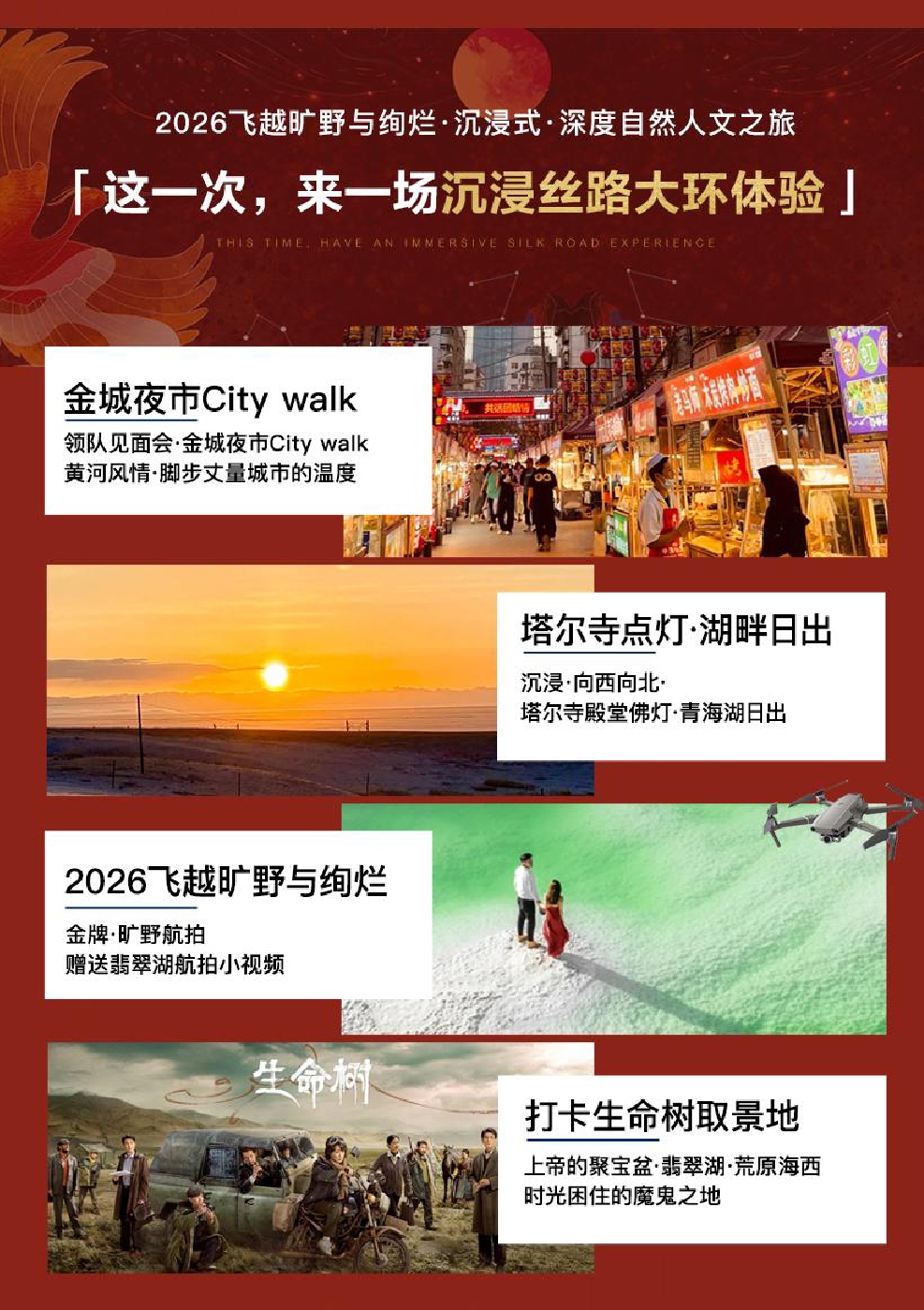 兰州|西宁均可|小城夜市+塔尔寺|点灯+青海湖畔|AAAAA1日出+茶卡盐湖|无人机航拍+翡翠湖|荒原明珠莫高窟|干年艺术长廊+鸣沙山|七色沙瓶+张掖七彩丹霞+河西走廊·自然·艺术·丝路深度自然人文之旅8日●Citywalk|明信片盖戳纪念打卡大环8大高光时刻|湖畔小烟火星河日出一览|·金牌摄影大赛
