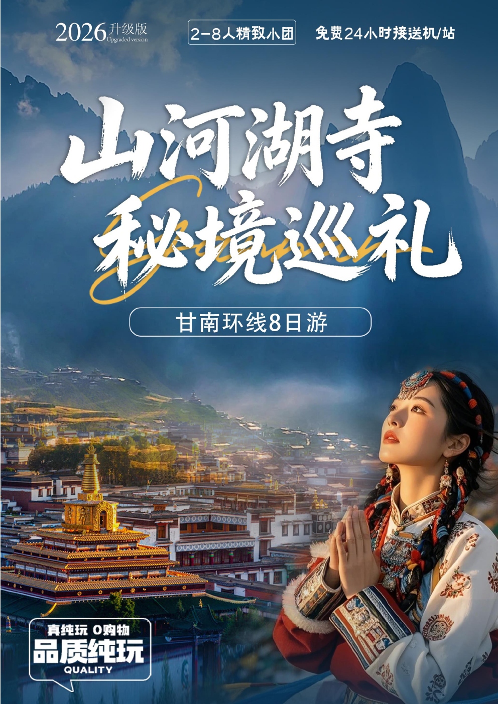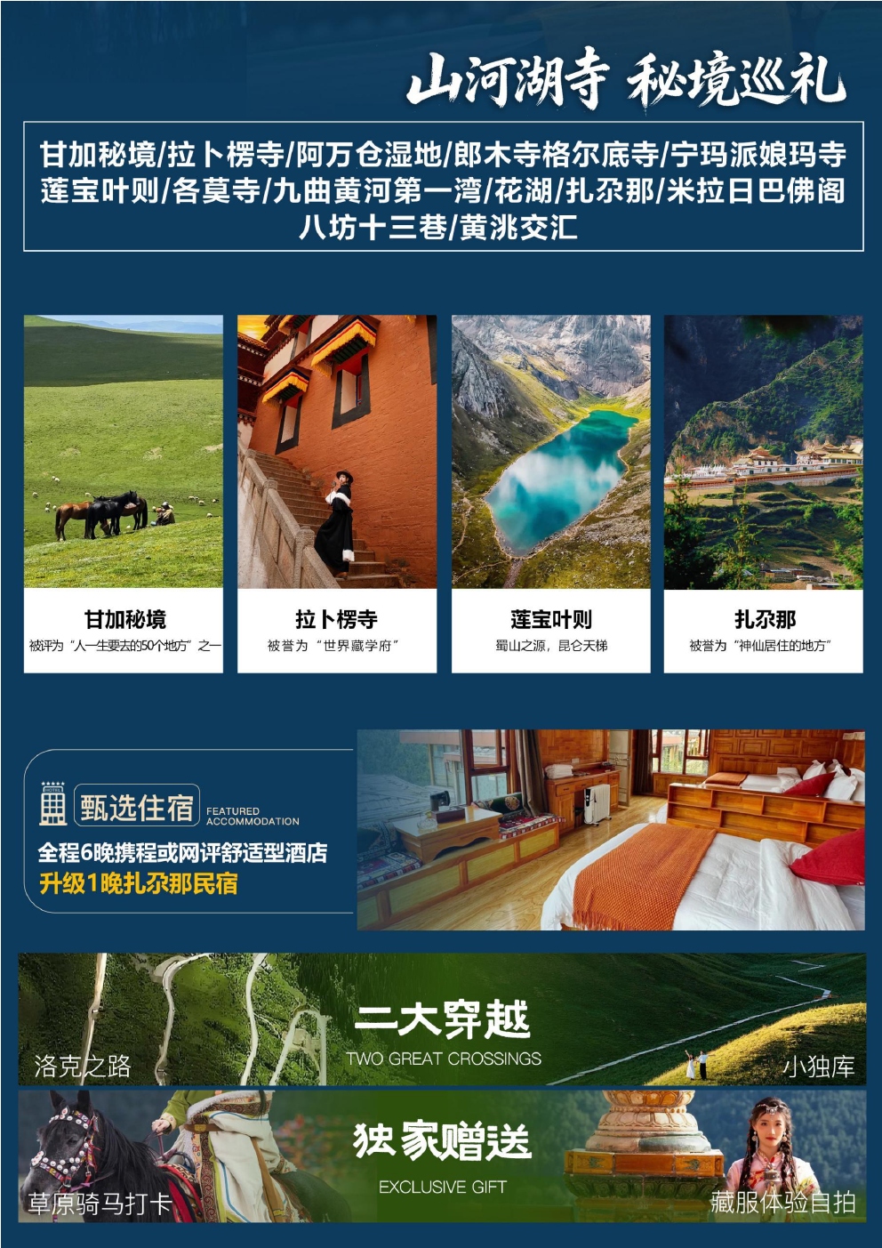 甘加秘境/拉卜楞寺/阿万仓湿地/郎木寺格尔底寺/宁玛派娘玛寺莲宝叶则/各莫寺/九曲黄河第一湾/花湖/扎尕那/米拉日巴佛阁八坊十三巷/黄洮交汇
