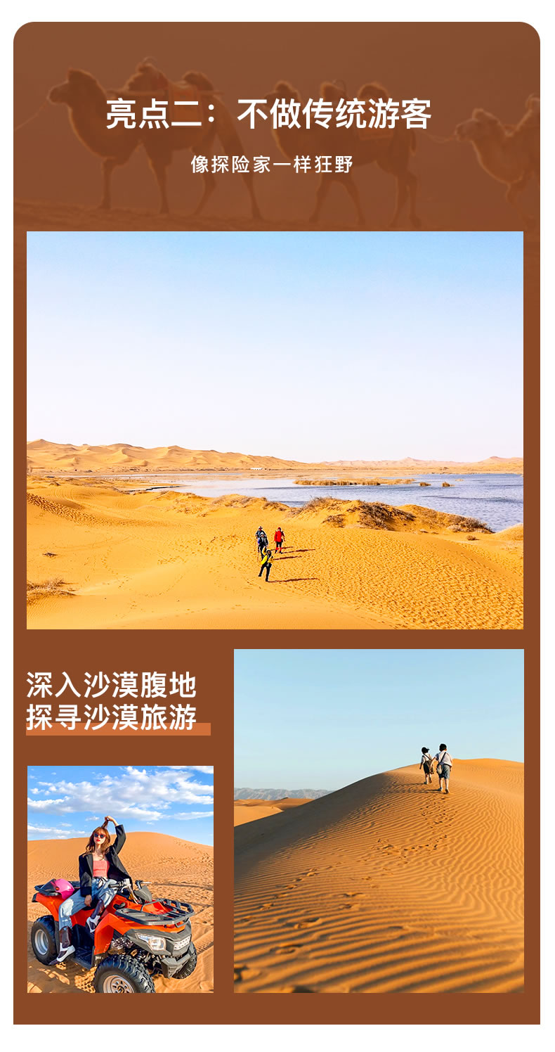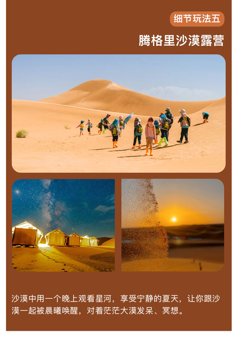 许多南方的小伙伴对沙漠有着刻板印象觉得夏天去沙漠会太热吧所以夏天的沙漠旅行,要冷门不少,但事实上,夏天才是西北沙漠的最佳旅行季呦因为纬度海拔相对较高,气候干燥西北沙漠荒原的气温相对南方平原要低不少,到了晚上这里的气温普遍只有十几度甚至个位数是个不可多得的避暑胜地!而且,沙漠的景观也要比大家想象中丰富太多了!宁夏的腾格里沙漠有着200多个湖泊绿洲星星点点的镶嵌其中湖泊、绿洲、山地和平原,风景非常多样。所以夏天一家人到沙漠避暑,孩子玩沙,老人避暑。